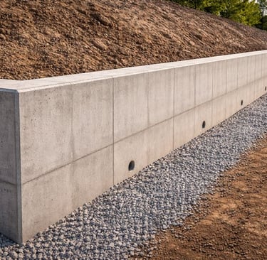 Concrete retaining walls built to manage soil pressure, elevation changes, and site stability.